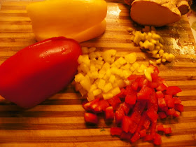 Chop the ginger root into small pieces, and dice red and yellow peppers.